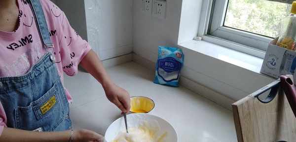 2.先把雞蛋的蛋清和蛋液分離,把蛋清加適量的糖然後徹底打發,再把蛋液攪散和打發好的蛋清攪拌在一起。