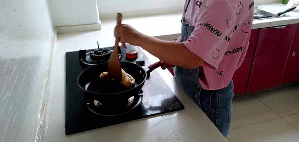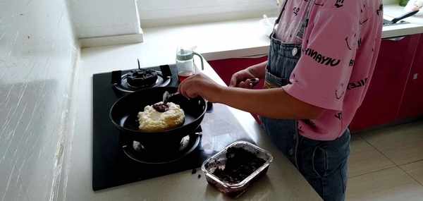 3.開小火,把處理好的雞蛋液放入平底鍋裡,小火慢煎,然後把紅豆沙放在蛋液上,待蛋液凝固之後把它對折一下,再用小火繼續慢煎,等蛋液幾乎完全凝固的時候,好吃的舒芙蕾就可以出鍋啦!
