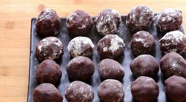 5、面板上撒一些面粉,取800克的豆沙,讓豆沙的表面上都沾滿幹面粉,然後在豆沙上取下小部分揉成圓球狀,這就是月餅的餡兒瞭。做好後將豆沙放入冰箱裡冷藏30分鐘,這樣豆沙就會變得比較硬,包餡兒的時候比較容易。