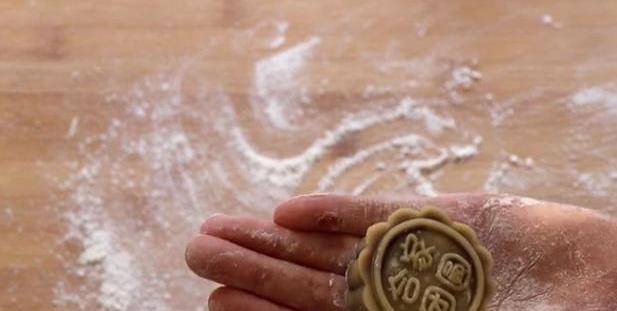 7、用面團將所有的豆沙都包好後,取出月餅模具,將做好的“圓球”壓成月餅形狀。