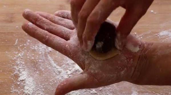 6、取出冷藏好的面團和豆沙,在面團上揪下一點,用手掌壓成薄皮,然後將豆沙放到上面,慢慢地用手指搟面團皮,讓面團將豆沙徹底包住。這個時候一定要細心,不能大力,免得面團皮破裂。最後還是個圓球狀。面團中由於含有大量的糖分,有些發粘,可以在手上放一些幹面粉防止粘手。也可以將皮搟的大一點,不過一定要薄,將豆沙包住之後,再將多餘的面團揪下來再次利用。