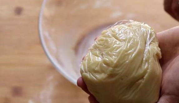 4、將和好的面團用保鮮膜包好放到冰箱裡冷藏一個小時以上。冷藏後的面團更有韌性,在包豆沙的時候不容易破裂。