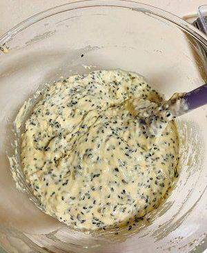 然後加入55克黑芝麻拌勻,打發的雞蛋糊體積明顯變小瞭
