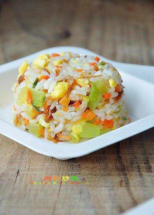 5.加入熱乎的米飯,肉松,翻炒均勻。