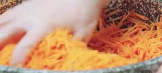 首先將胡蘿卜去皮,用刀切成細絲或者是用專門的銼刀,將切好的胡蘿卜絲加入1大勺鹽,