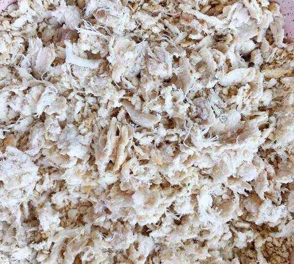 7.炒好的雞肉放進料理器打絨,打好的容平底鍋在炒一炒,炒好的雞肉絨再放進料理器進行磨粉,磨好晾幹即可