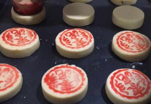 【步驟五】包好的面餅,用手稍微按扁按平,可以放入圓餅模具裡,將它平面整理光滑。再蓋上紅戳,紅色是用的食用色素。在老一輩的時候,蓋上紅戳是為瞭區分不同的餡料,這也是老一輩的智慧。而現在這種紅戳,卻給人滿滿的回憶。