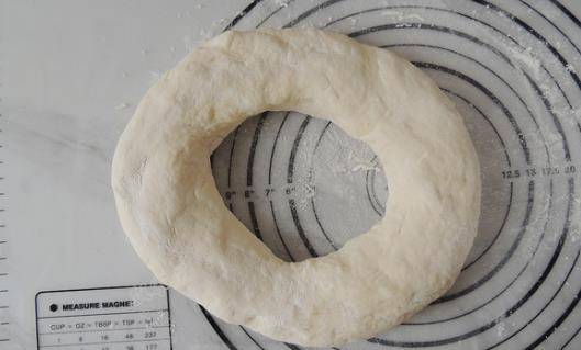 【步驟三】面團餳發至兩倍大後,將面團從中間掏一個洞,整理成圓環的形狀,然後再整理成粗細均勻的長條,接著分成均等的小劑子。