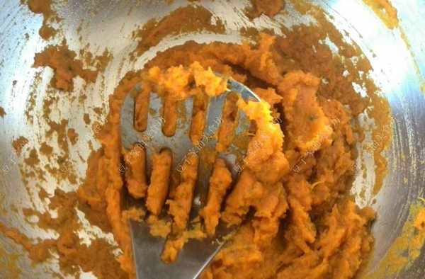 制作:1,蒸熟的南瓜按壓成味泥狀,如果感覺不細膩,可以用料理機打成糊糊和面。