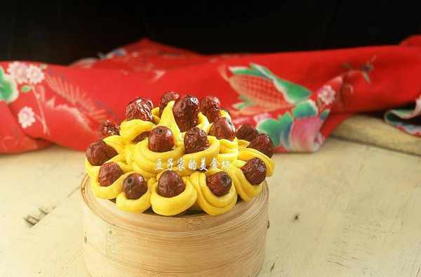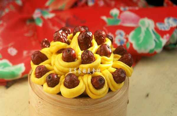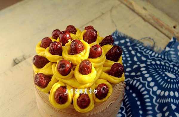 食材:南瓜泥一碗,面粉二碗,酵母粉6克,紅棗適量。