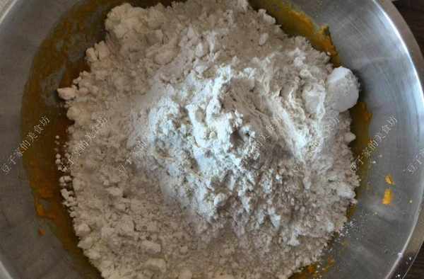 2,南瓜泥裡邊加面粉進來一起和面。南瓜的含水量有很大的差別,所以不要加水瞭。