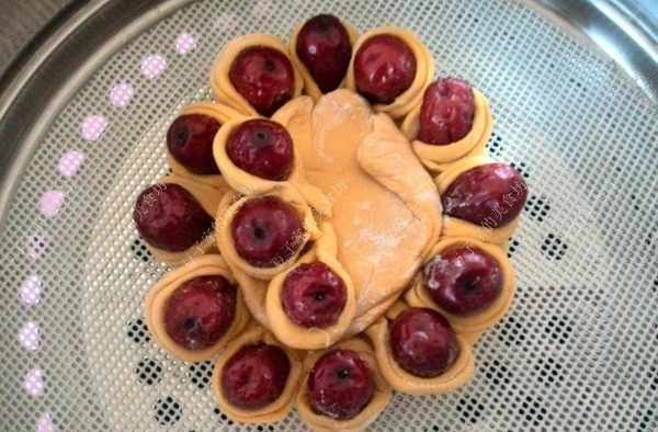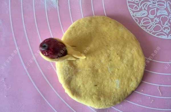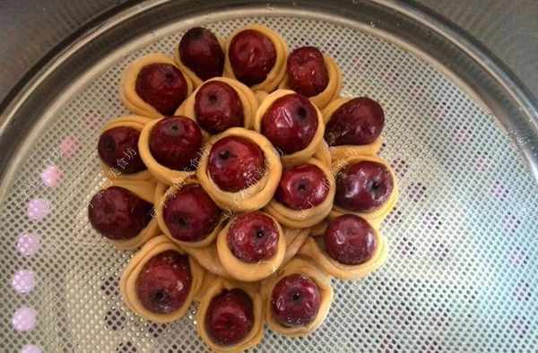 7,一個紅棗,用一段面條裹在紅棗的中間位置,沾點點的水,按在面餅上邊,開始做步步糕瞭。