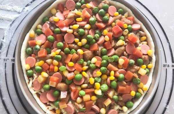 材料:餅皮:高筋面粉110克水65克糖2克鹽1克玉米油15克酵母1.5克披薩餡料:雞腿肉1個玉米適量豌豆適量紅蘿卜一小節小火腿腸2根蕃茄醬適量馬蘇裡拉芝士適量