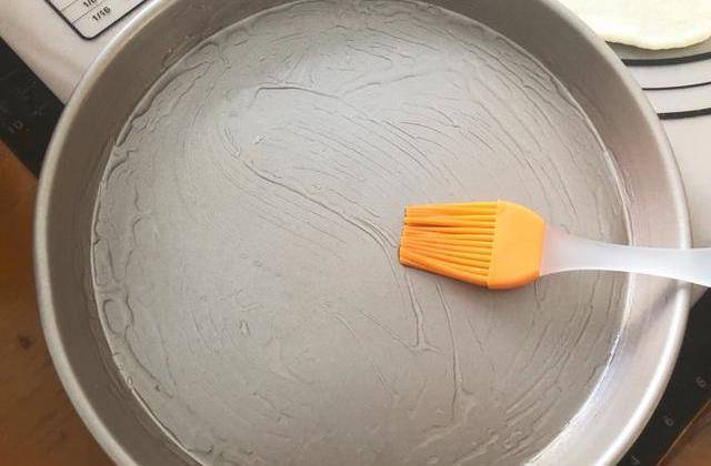 14、面團拿出排氣,蓋上保鮮膜松弛20分鐘,將面團搟成大圓片
