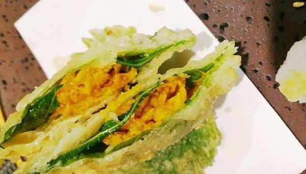 海膽40克、蘇子葉2片、天婦羅粉50克、蘿卜10克、薑2克、淡口醬油、味淋、木魚花水