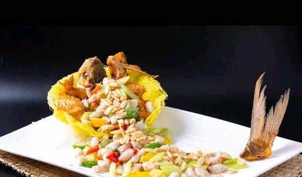 鯪魚1條、西芹4兩、紅黃彩椒1顆、橄欖仁30顆、黃色網皮3片、鹽、糖、生粉