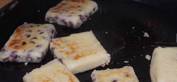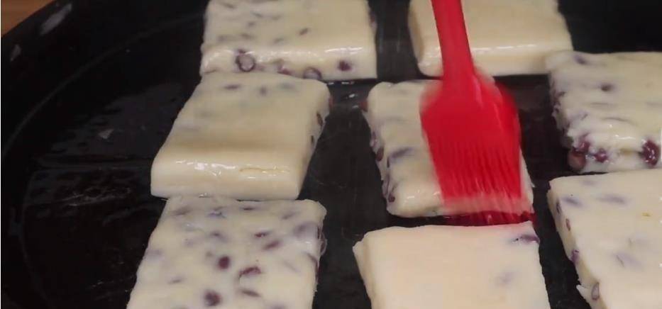 5.拿出電餅鐺出來,在裡面均勻的刷上一層食用油進去,把電餅鐺預熱後,將我們剛才切好的小塊紅豆餅坯放入電餅鐺裡面,全部放進去之後再餅坯上面刷上一層食用油,然後蓋上電餅鐺的蓋子,開小火將將紅豆餅烙5分鐘的時間。