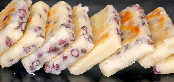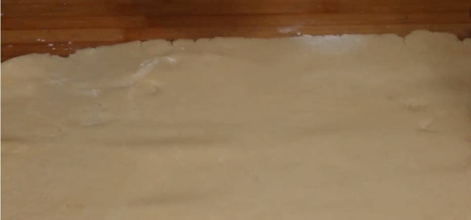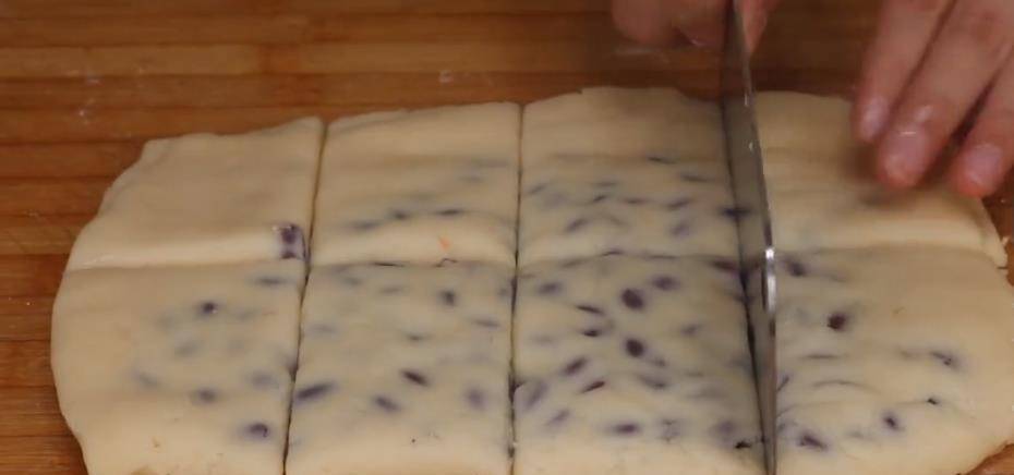 4.整理好紅豆之後將加有紅豆的面片折疊起來,大概折疊兩次的樣子,然後拿出搟面杖出來繼續搟,將我們剛才折疊好的紅豆面皮再次搟薄,搟均勻。搟好之後拿出刀將其切成大小均勻的小塊,切好之後就像我們下面圖中的樣子。