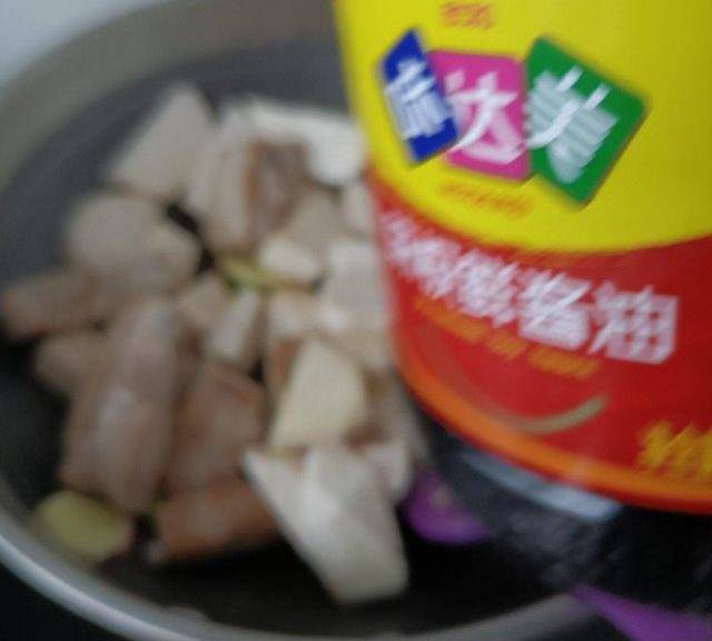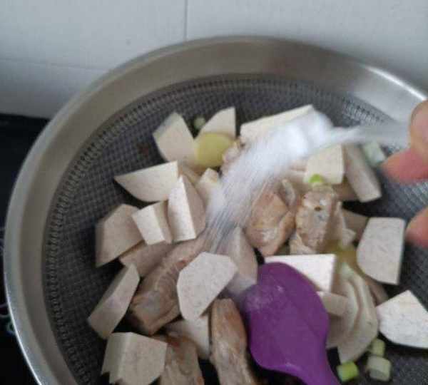 第8步、放芋頭和蔥薑翻炒,翻炒的過程放食鹽。