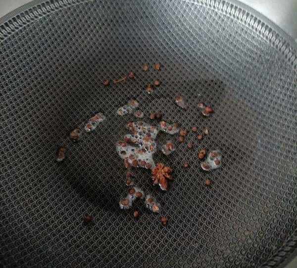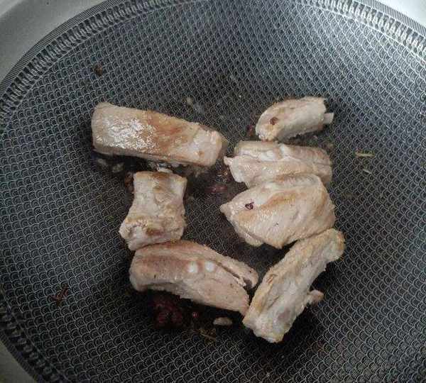 第6步、熱鍋冷油,油熱放花椒八角爆香。