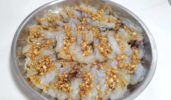 3)一半蒜蓉先放鍋裡炒香,再與生蒜蓉放一起,放食用油,生抽,蠔油調味,把蒜蓉醬汁淋到蝦上面。