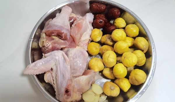 食材準備:新鮮板栗一斤,老雞半隻,紅棗幾個,薑片,枸杞少許。