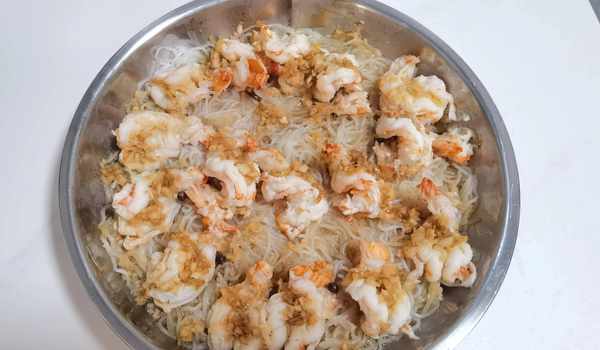 2)蝦開背,去蝦線,去蝦殼。粉絲墊底,放上處理好的蝦。