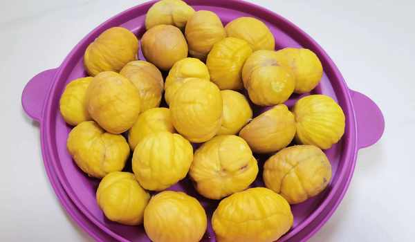 1.新鮮板栗清洗幹凈,用刀劃傷十字刀,冷水下鍋,煮開,再煮一兩分鐘,撈出,趁熱剝殼,剝皮。