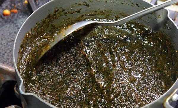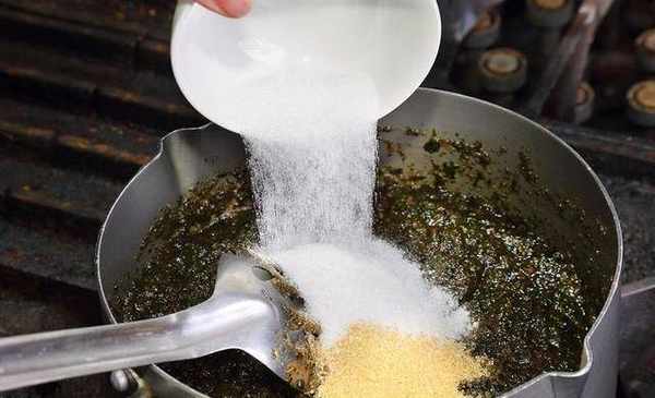 待表面開始冒泡時,表示已煮滾,此時繼續不斷攪動、滾煮,約2分鐘後關火、放涼,即成海苔醬。
