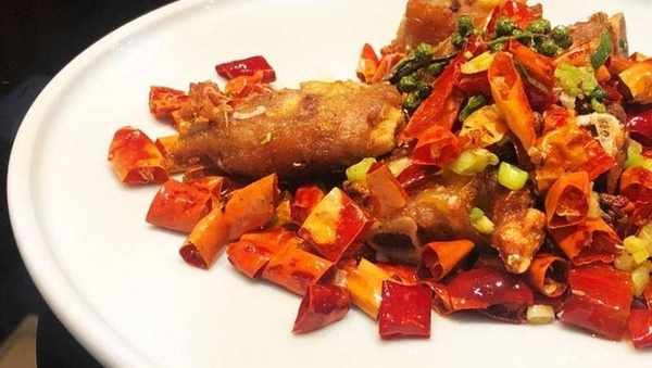 用炸辣椒和香料的油把豬腳炸香炸酥表皮(豬腳可以在焯水後剔骨再醃制),豬腳撈出控油後和炸好的辣椒、青花椒混合翻炒均勻即可