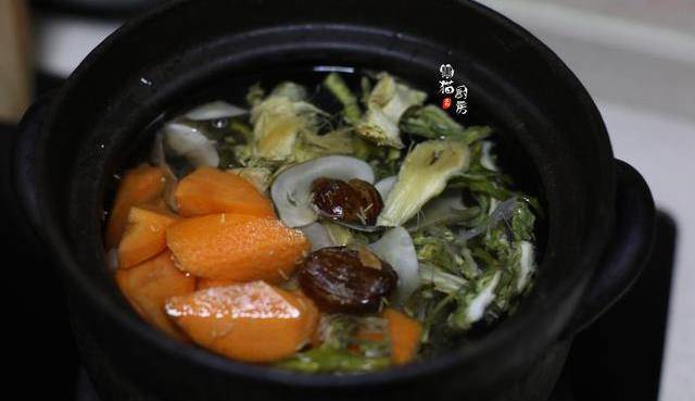 3.把汆燙過的豬骨、響螺肉、霸王花和切成塊的胡蘿卜放入湯鍋裡,加入適合一傢人食用的水量,加2顆蜜棗增加這鍋湯的鮮甜。