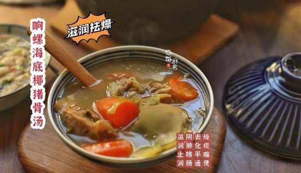 食材:響螺肉2塊,幹海底椰10克,霸王花2-3棵,胡蘿卜1根,豬脛骨400克,蜜棗2顆,鹽少許。