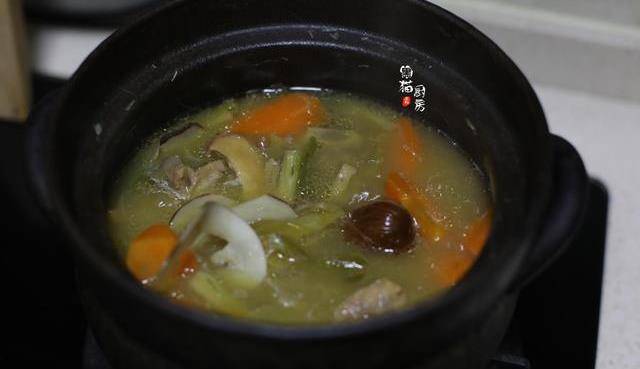 4.大火煮沸後,轉小火煲50分鐘左右,煲至湯微微有順滑粘稠感,這是因為霸王花的作用,加少許鹽調味。
