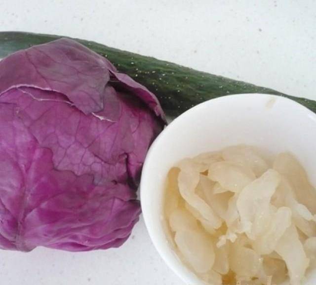 原料:海蜇絲、紫甘藍、黃瓜、白芝麻。
