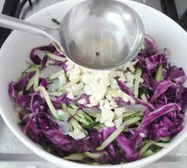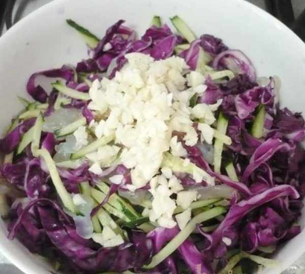 第8步、醃制好的紫甘藍去多餘水份,連同黃瓜絲、海蜇絲放到大碗裡。加入鹽、糖、醋、辣椒油最上面放上蒜末。