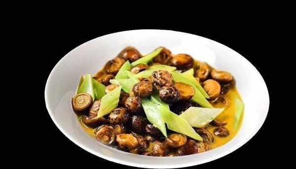 鍋留底油,放入蒜子爆香,加入花菇、青筍翻炒均勻,淋入用雞汁、雞粉、香油、鹽、白胡椒粉調制的味汁。