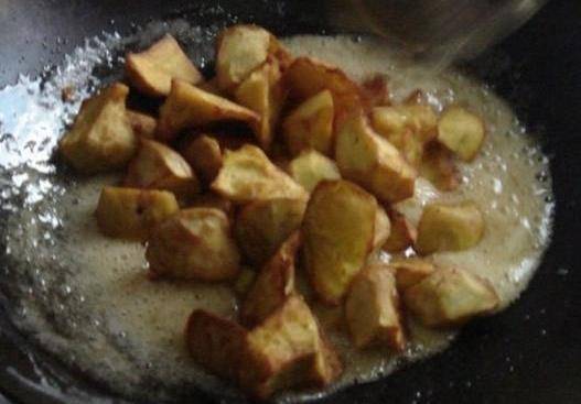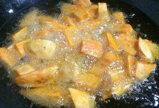 鍋內倒油,待油溫八成熱的時候,下地瓜炸;