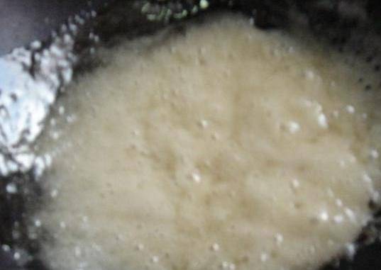 熬到糖稀冒許多小泡泡;(如果沒把握就用筷子蘸一點糖稀,如果能拉出絲就好瞭,或者拿起鏟子,上面能拉絲也就好瞭)
