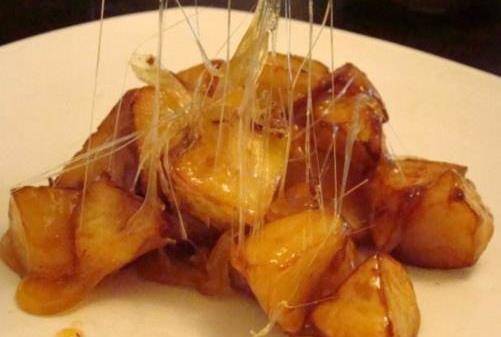 做好的拔絲地瓜要沾點水涼水吃,才不粘牙。