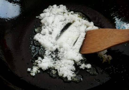 小火熬糖,中間用鏟子不斷攪拌,使白糖融化;(白糖融化後顏色會慢慢變深)