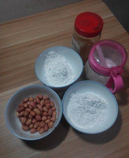 魚皮花生,小時候比較愛吃,尤其是外面那層酥皮。那時候還真的以為是包瞭一層魚的皮,所以才叫這麼個名字......好啦,魚皮花生需要的材料有:炒熟的花生,糯米粉,紅薯淀粉,蜂蜜,鹽。花生,糯米粉,紅薯淀粉,蜂蜜比例按1:0.5:0.5:0.5,鹽隻需要一丟丟。若是吃得不甜,適當減少蜂蜜。那個臟臟的紅色蓋子裝的,是蜂蜜來著......是我媽拿著瓶瓶罐罐換瞭2趟車去蜂農那裡買回來的。蓋子擦洗不出來瞭~