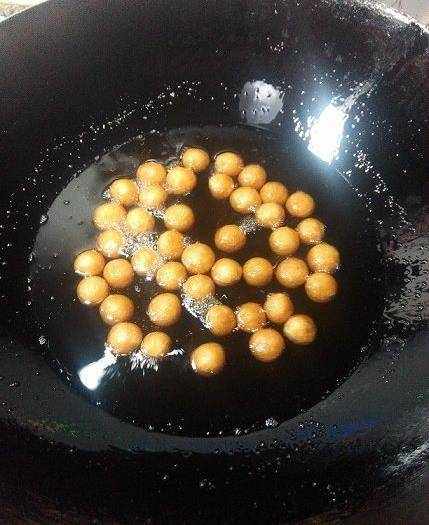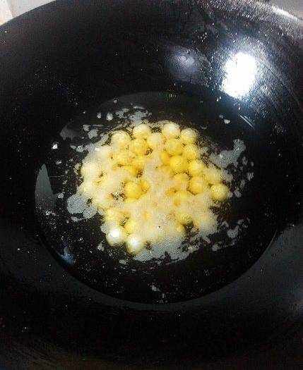 鍋裡放多食用油,油溫3成熱的時候放入搓好的花生胚子,小火,小火慢炸。