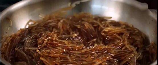 第三步,把紅薯粉放到燒開的水裡煮5分鐘,煮軟煮熟後,用涼水沖,剪成線條放油鍋裡炒,加鹽,2勺醬油,黑胡椒;