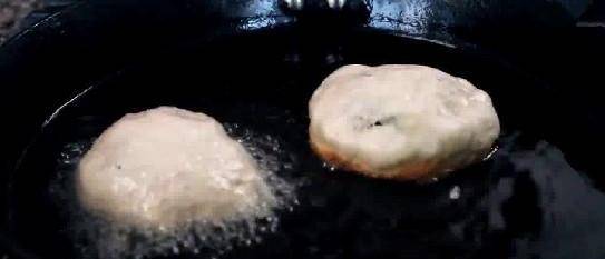 第四步,接著倒油準備炸餅,揉面粉團時候,最好在手上塗點油,這樣面粉不會占手,面團攤平,然後包餡,放鍋中炸;