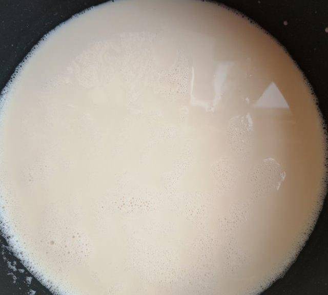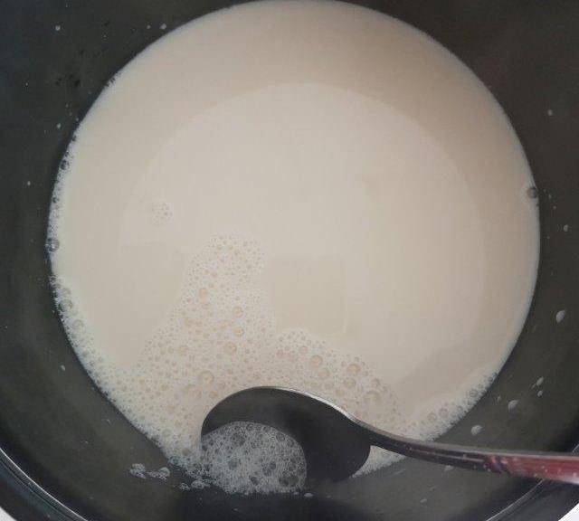 第5步、用濾佈將豆渣過濾掉,豆漿倒入鍋中,大火燒開後轉小火,繼續加熱幾分鐘,要勤攪拌,防止粘鍋底。