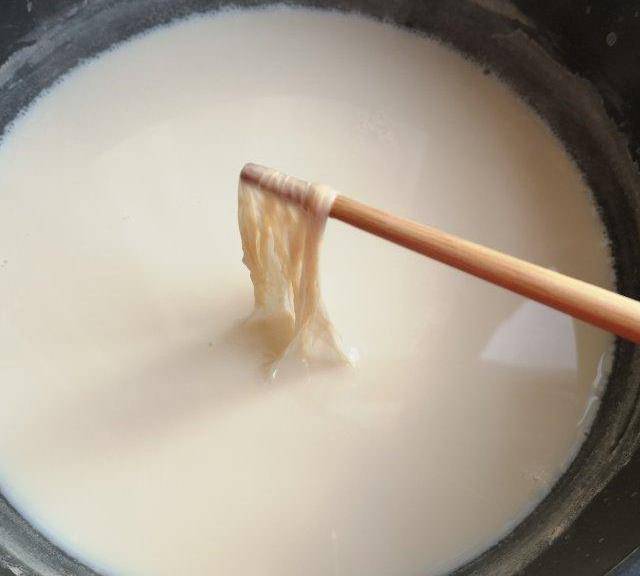 第7步、熬好的豆漿,靜置一會兒,目的是為瞭降溫,豆腐腦的成形溫度大概是80至90度,我沒有溫度計,隻能用下面的辦法判斷溫度:當豆漿的表面結出豆皮,用筷子可以挑出豆皮的時候,就是做豆腐腦的溫度瞭。