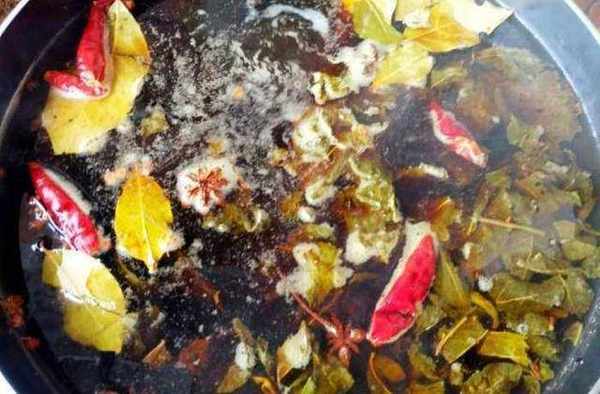 第二步:鍋中加入水,放入香葉,幹辣椒,八角,桂皮,花椒,煮開。