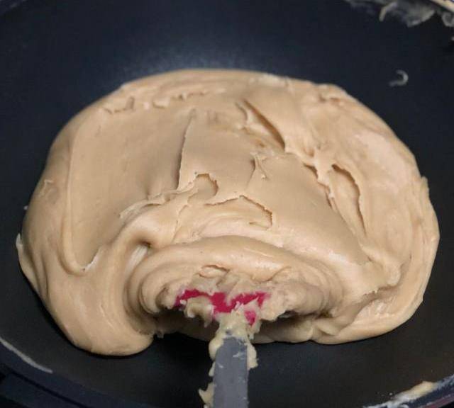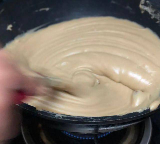 第5步、5.不停翻炒至,餡料越來越濃稠,這個硬度需要自己來掌握,也不能炒太幹,因為炒好以後的蓮蓉餡兒晾涼冷藏以後還會變硬一些,炒到比買的餡兒的硬度稍微軟一點即可。