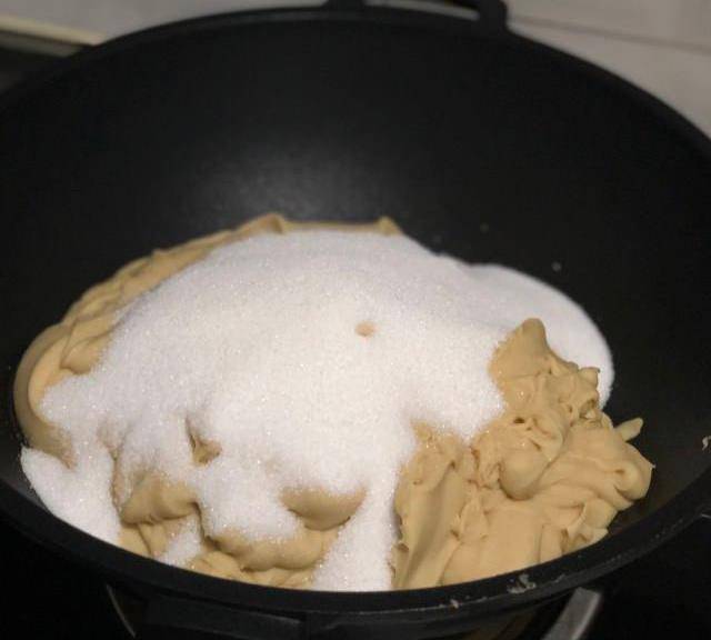 第3步、3.打成泥以後倒入不粘炒鍋,一次性加入細砂糖,開中火,不挺翻炒,每一次翻炒都鏟子要緊貼鍋底,避免糊鍋,有蒸氣冒出來以後轉最小火翻炒,配方的量做出的蓮蓉餡兒還是比較多的,所以炒鍋要足夠大,並且還要有足夠大的力氣,兩者缺一不可,不然就要減量來制作。