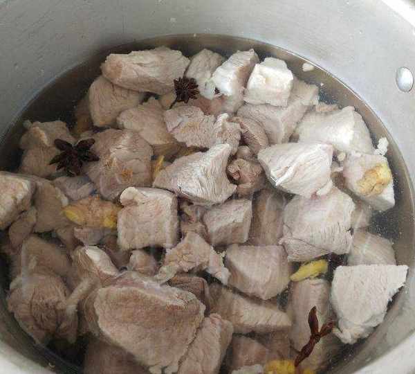 第1步、裡脊肉洗凈,冷水入鍋焯水,洗去浮沫後,放入薑片和八角,再倒入料酒。